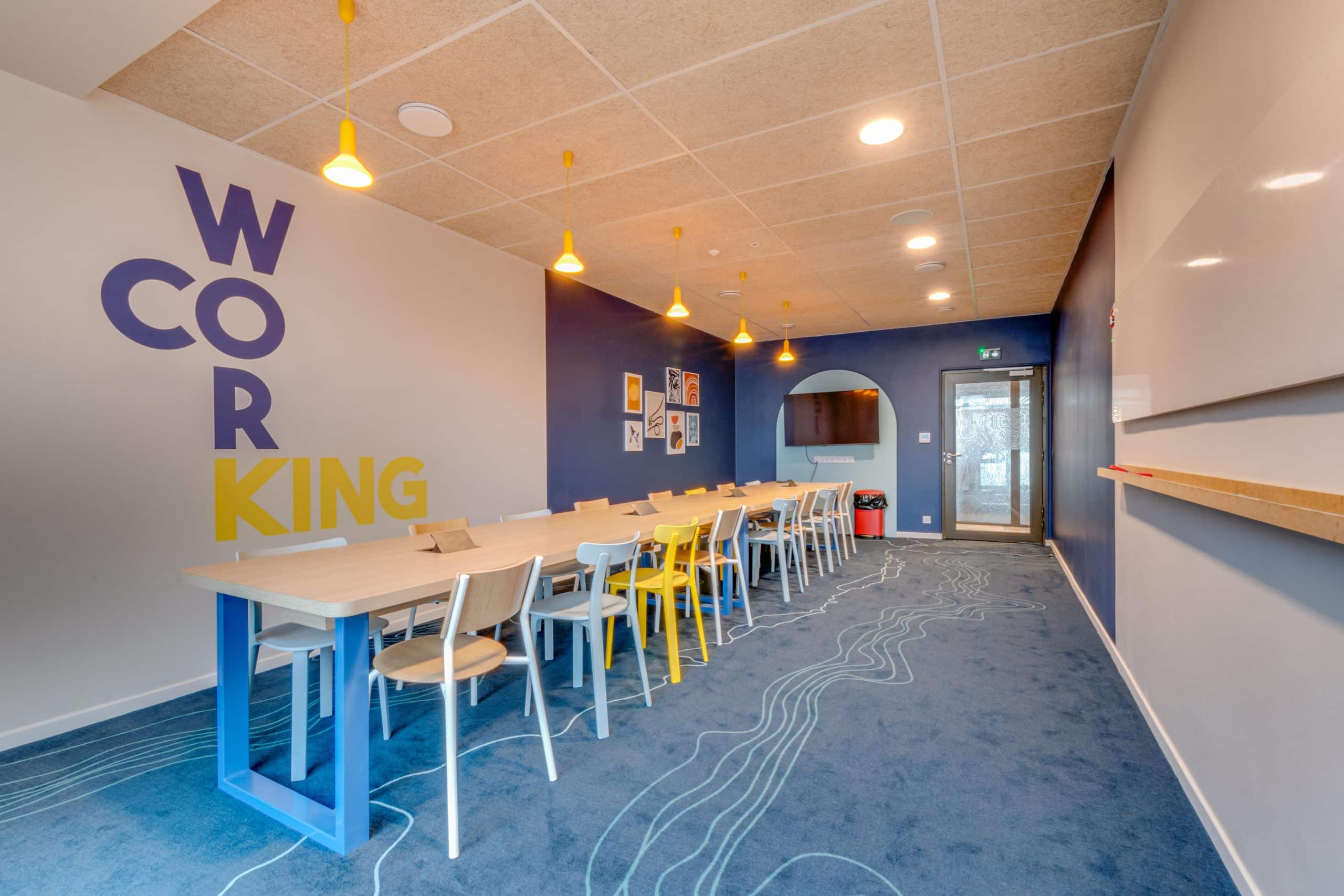 Pour favoriser les échanges et la productivité, nous avons imaginé une grande table de coworking pour 16 personnes, accompagnée d’un habillage mural autour de la télévision. Ce mobilier, à la fois robuste et élégant, s’intègre parfaitement dans l’environnement de travail collaboratif.
