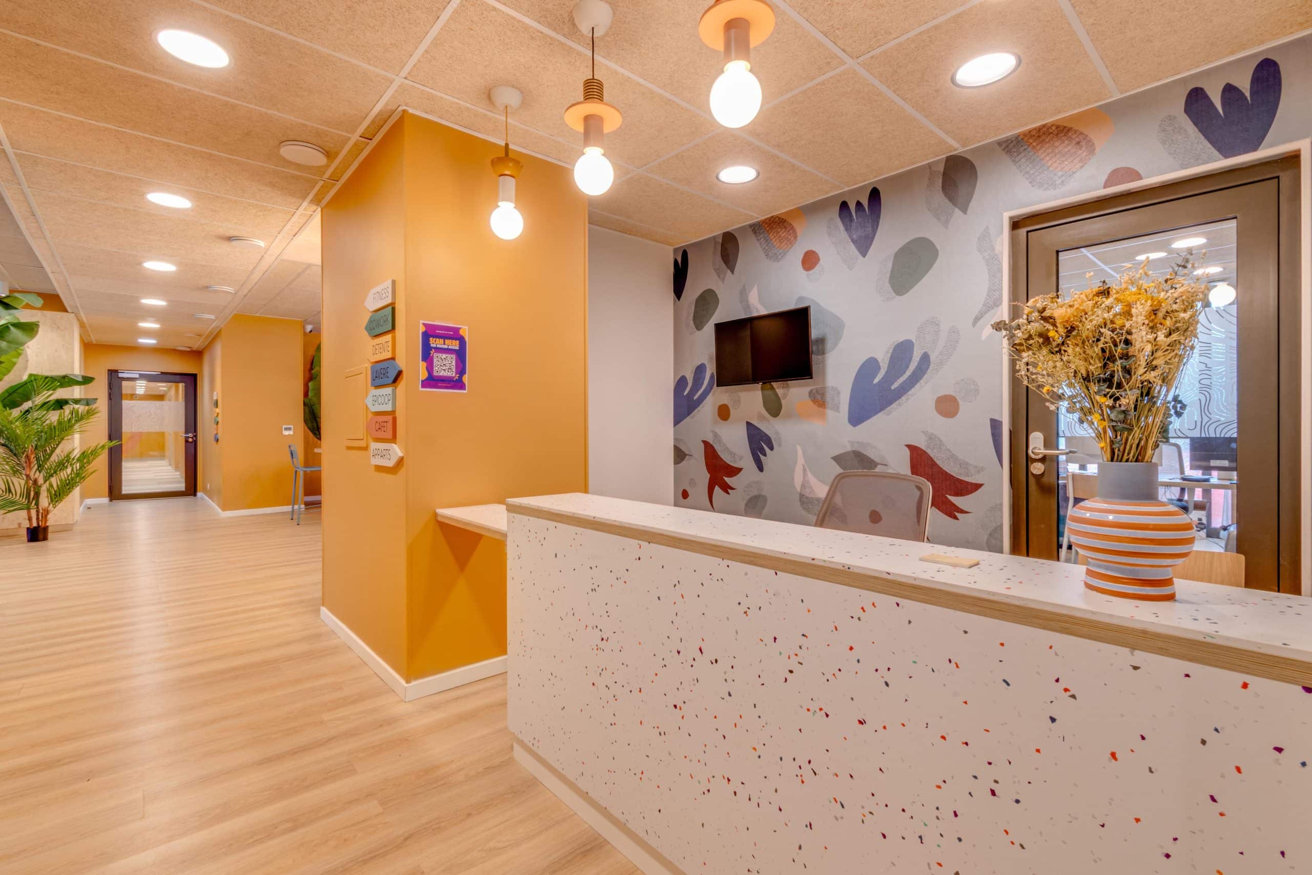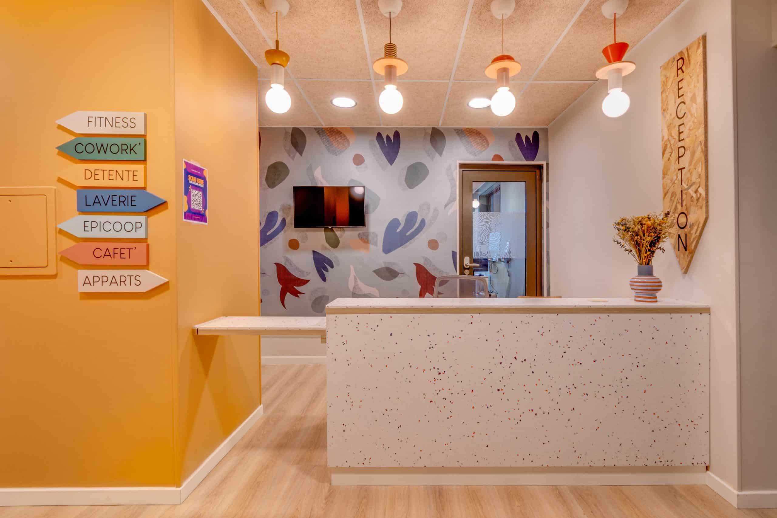 Le desk d’accueil blanc avec motif terrazzo apporte une touche contemporaine à l’entrée de la résidence. Complété par une armoire de rangement pour le régisseur, cet ensemble allie praticité et élégance, tout en répondant aux besoins logistiques du lieu.