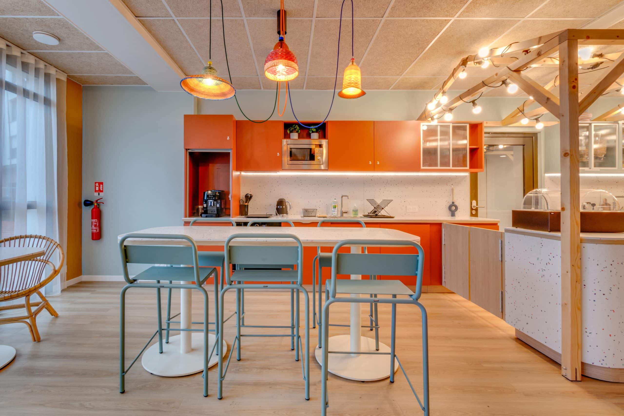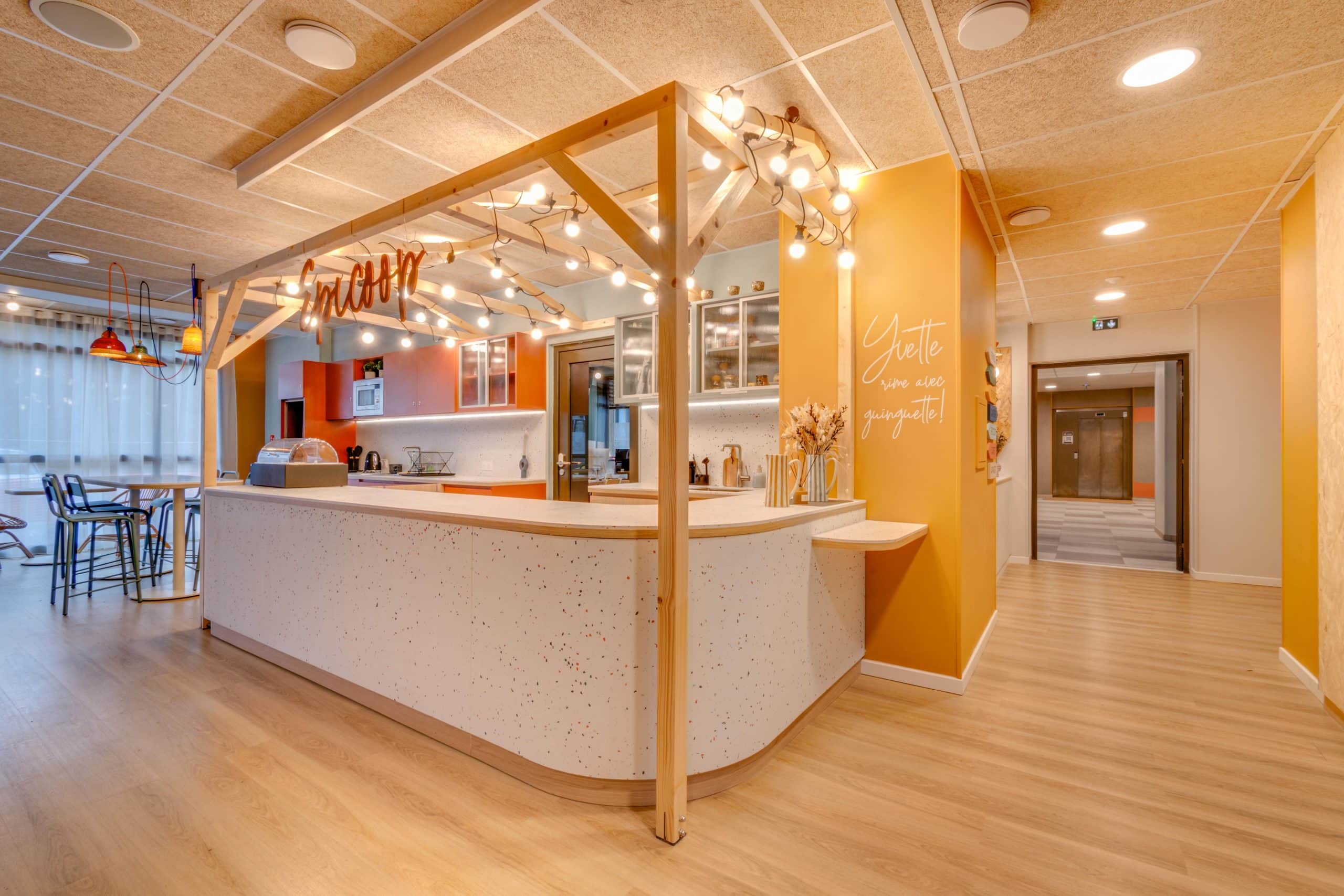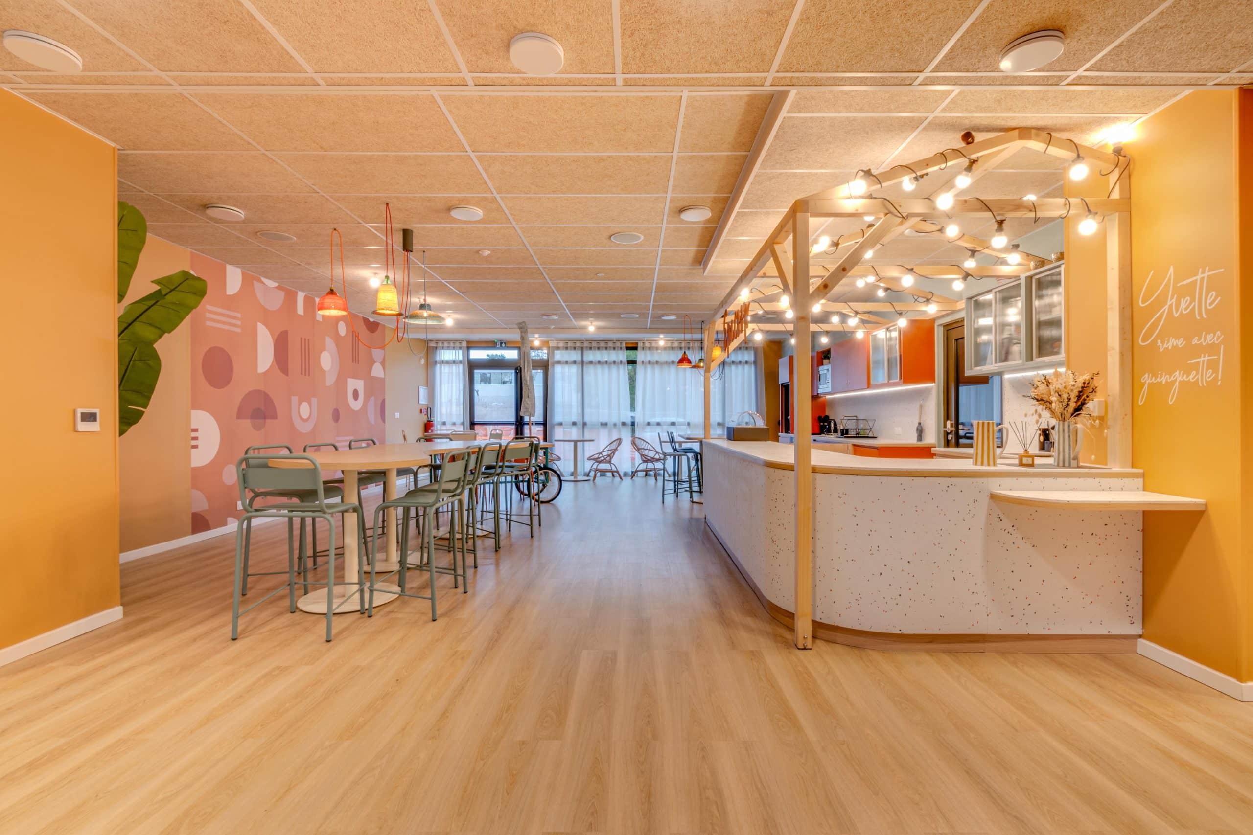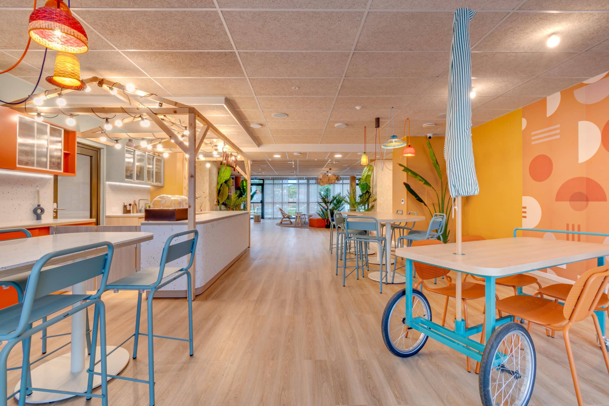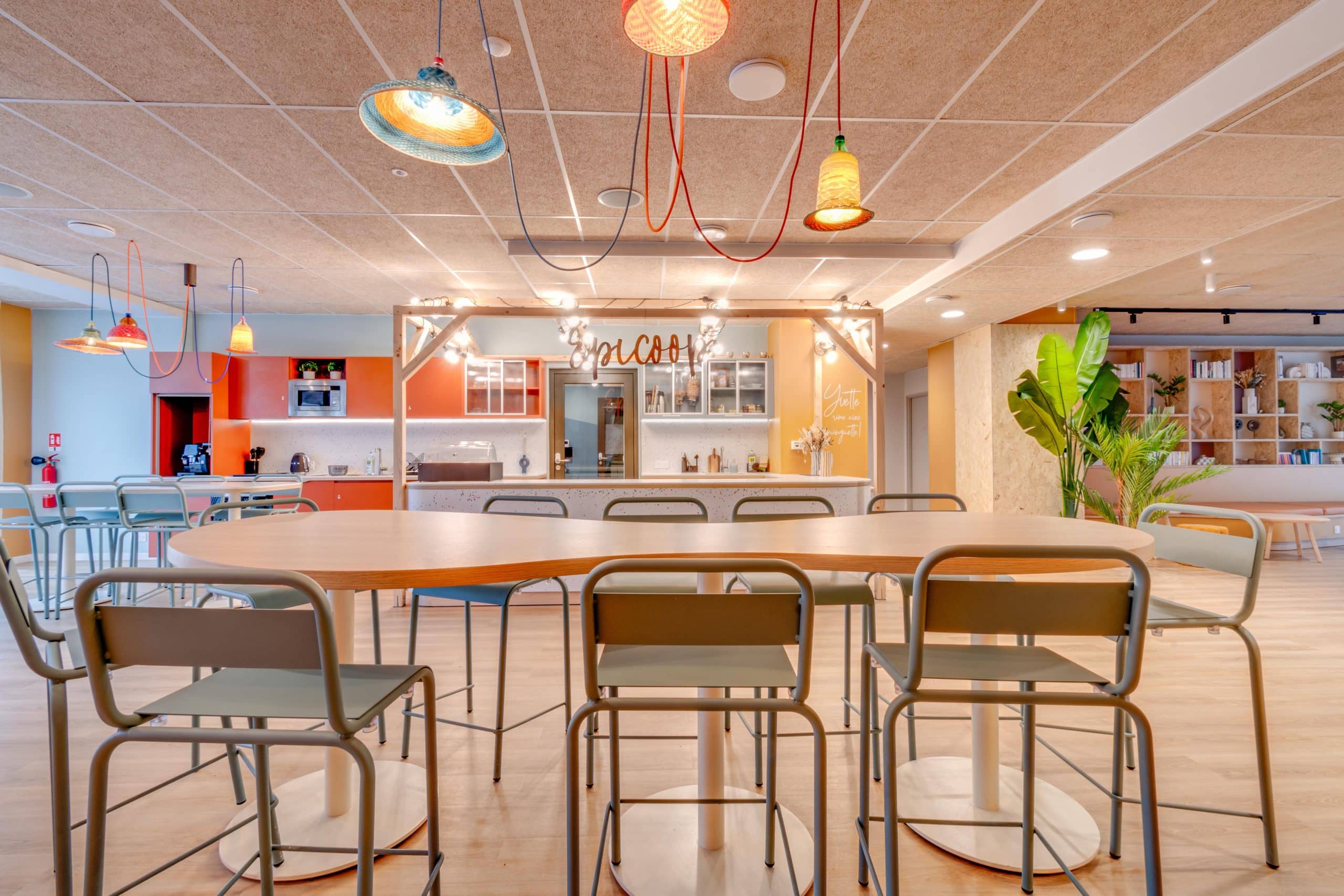 La cuisine couleur brique (Polyrey) est équipée d’un rideau enrouleur pour la marche à café et de portes coulissantes, optimisant l’espace et la circulation. Nous avons également installé une pergola et créé des tables avec pieds ronds en Inbase, ainsi qu’une table commune arrondie pour les moments de convivialité.